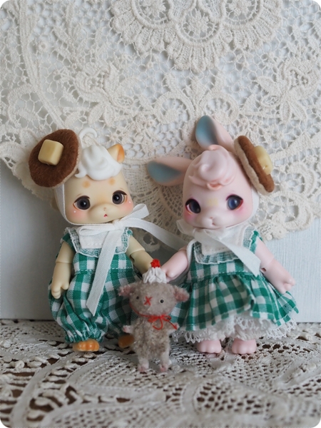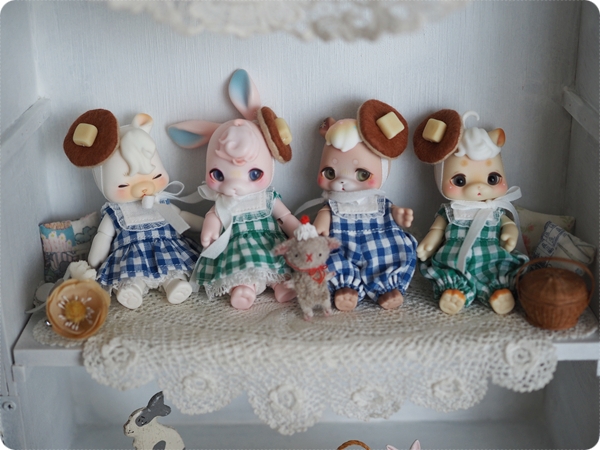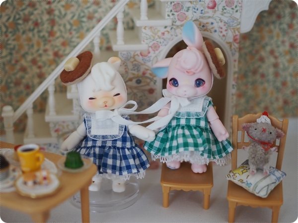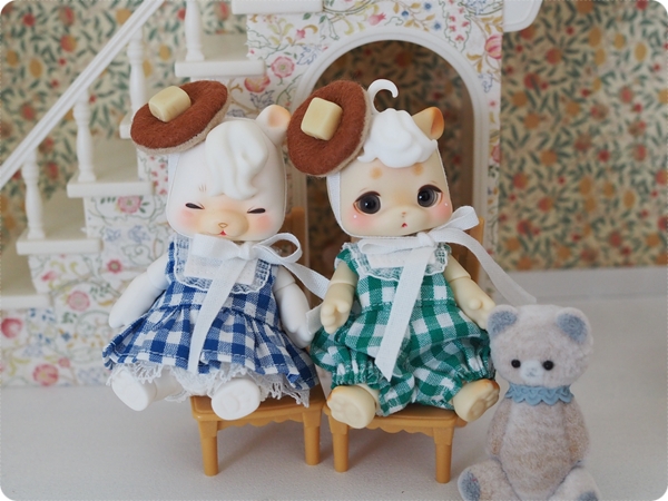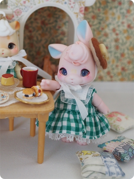 ティードレスをイメージして作り始めた乙女のお茶会なのですが、ピンタックを入れているうちにピンクハウスみたいなボリュームになっていて、そっかあなたたちとっても小さいもんねーとくむここちゃんたちの小ささに改めて愛しくなりました。