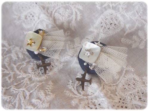 ブローチには飛行機のモチーフなどを付けました。